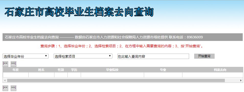 石家庄市人力资源和社会保障局网站专门开辟了毕业生档案去向查询链接,登录http://rsj.sjz.gov.cn/后,在“网上服务大厅”专题栏目点击“高校毕业生档案去向查询”,按提示填写相关内容后,即可查询1997以来已到我市的毕业生档案去向情况。